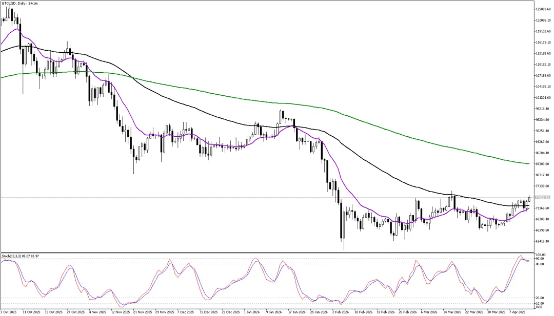 看涨确认取决于价格是否能维持在约 $74,200 黑色移动均线的支撑位上方。随机指标目前处于超买,暗示短期内回调至约 $71,000 的可能性较大,而这种回调在趋势延续至长期绿色移动均线目标位之前是健康且正常的。