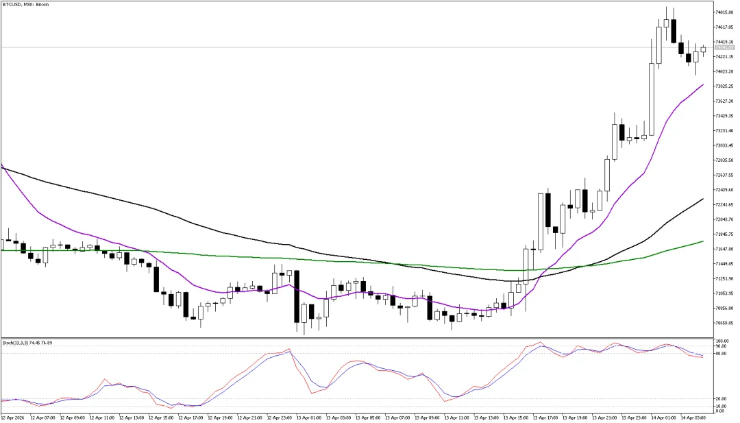 重点关注的交易形态:目前最为合理的情景是价格出现回调。交易者将密切观察价格触及上升紫色移动均线(约 $73,800)时的市场反应。若价格在此处干净利落地反弹,则表明当前看涨趋势依然强劲;若价格跌破该均线,则在下一波上攻行情启动之前,很可能先向 $72,000–$73,000 区间展开更深幅度的修正。在当前时机入场买入,存在在过度拉伸行情的顶部追高的风险。