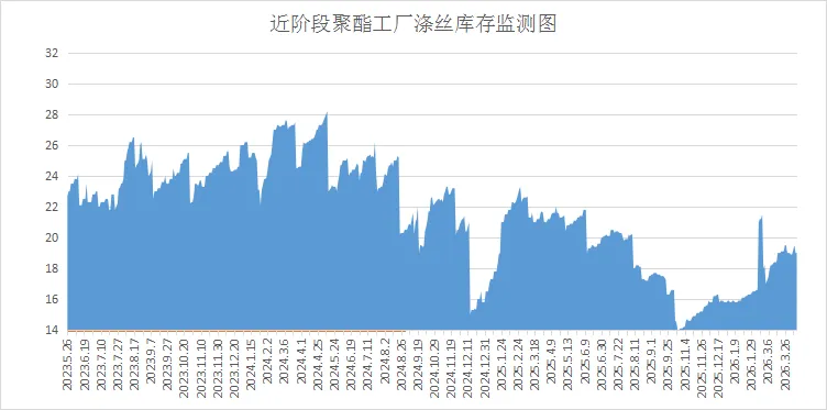 产销方面,昨日尾盘部分用户逢低补仓,今日市场交投气氛冷清,涤纶长丝整体产销回落。聚酯产销平均为33.1%。库存方面,根据绸都网统计数据来看,现如今聚酯市场整体库存集中在13-27天;具体产品方面,其中POY库存至15-26天,FDY库存至10-25天附近,而DTY库存则至16-26天左右。