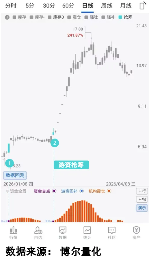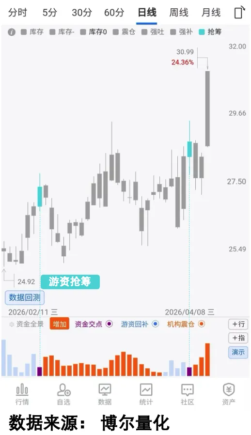 就比如下面这只股票,在2026年3月行情最为焦灼的这段时间当中,该股能够录得25%的涨幅是相当不容易,但是我们也可以发现股价在最后几天开始突破之前,其实一直处于反复拉扯的状态,所以相信很少有人会关注到,但是如果通过量化大数据,结合交易行为数据观察,就会发现其中的不一样了。