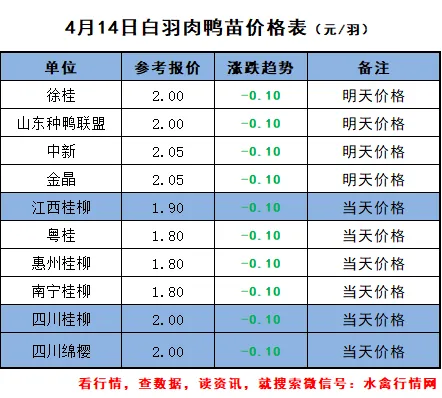 (1)北方报价:4月15日报价下跌1毛,主流孵化场报价2.00-2.05元/羽。