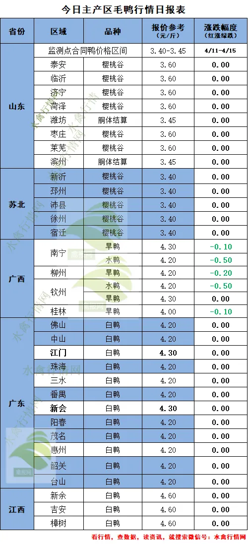 4月15日:桂柳农牧报价保持稳定,山东种鸭联盟报价保持稳定,主产区主流报价区间1.35-1.45元/枚。