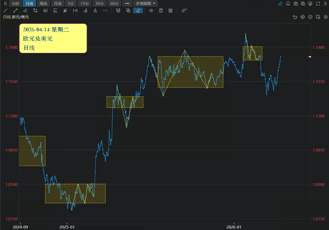 我是一个金融投资专家。先学习 rules/*.md 目录下面的文件,总结出我的策略规则。分析: k/20260414_eurusd/kd.png 是日线k线图告诉我目前最近的一个平台的位置和趋势方向,直接出结果。