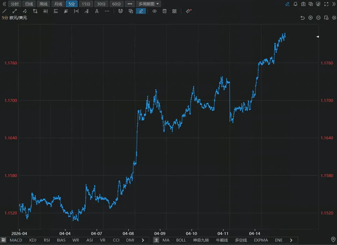 5分钟图方向:上涨(从1.1520涨至1.1760+)