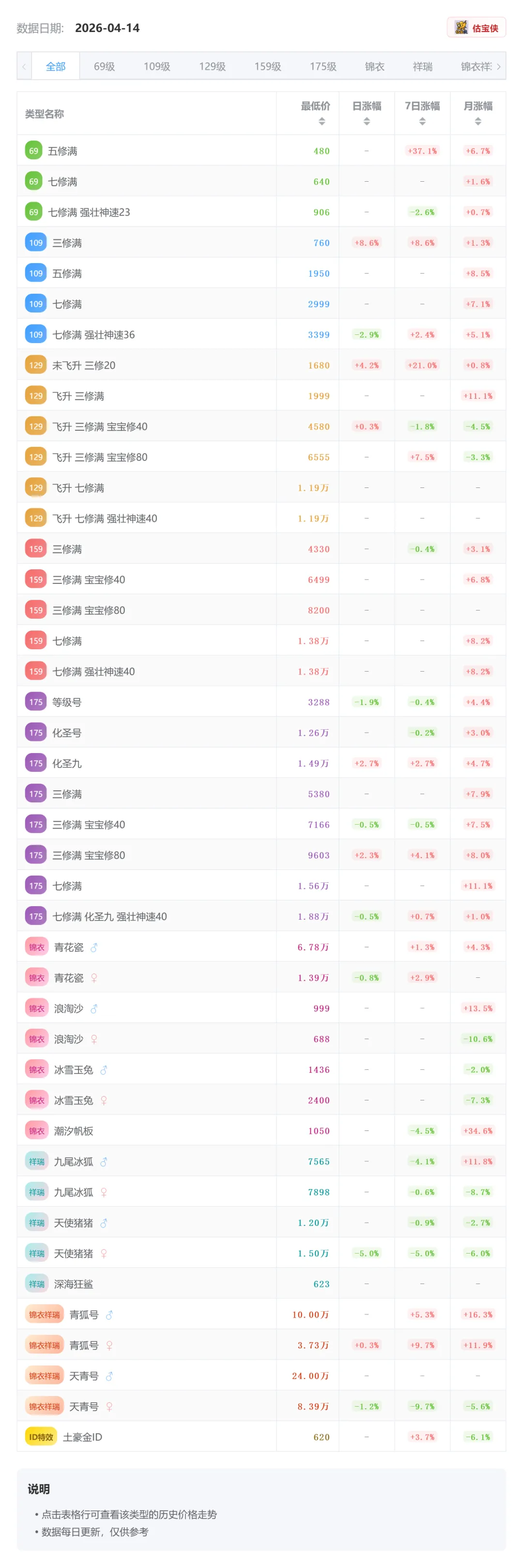总结当前市场核心特征:1️⃣ 低等级(69)出现强势反弹2️⃣ 中端(109/129)稳步上涨但分化明显3️⃣ 高端(175)整体稳定4️⃣ 锦衣祥瑞波动加剧,资金集中头部资产