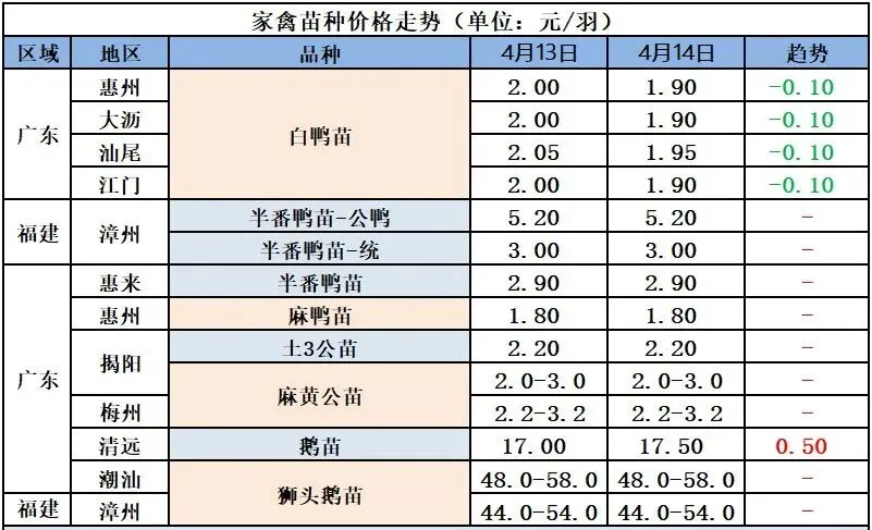 2026年4月15日鸭苗价格行情:(单位:元/羽)