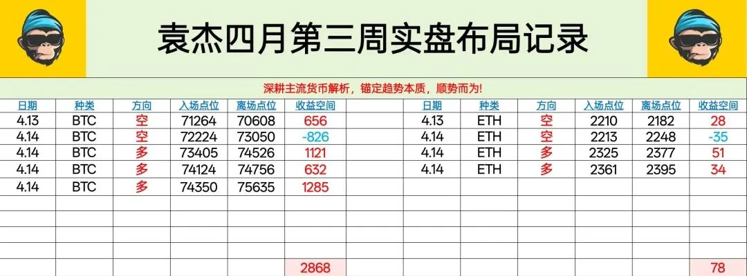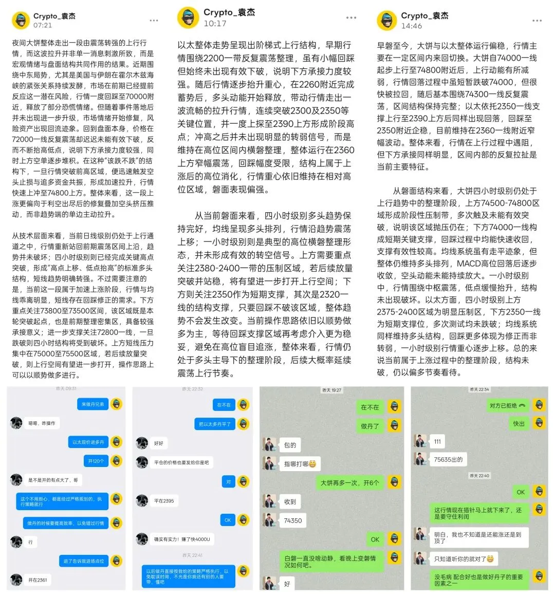 日内的行情走的还是比较清晰的,大饼从早间71600一线企稳后开始逐步抬升,盘中虽有反复,但整体节奏始终围绕“低点不断上移”展开,结构上属于典型的震荡上行,午后顺势突破并站上74500一带,随后进入高位横盘整理,晚间再度冲高至76000附近后出现回落,但回落幅度有限,整体依旧维持在高位运行;以太走势同步,从2200上方震荡上移至2400附近,冲高2416后回落至2350一线,日内同样是一个逐步抬高重心的过程。其实这种行情其实不难做,关键在于有没有在一开始就把方向看清。早间我们给出的就是低多思路,整个日内基本围绕这个方向去做,结构配合得很好,实盘这边也是持续有结果反馈回来。还是那老生常谈的话,市场从来不缺机会,缺的是在机会出现时有没有勇气去执行,很多人总在犹豫中错过行情,而真正能走出来的,往往只是那一小部分敢于跟随节奏的人。