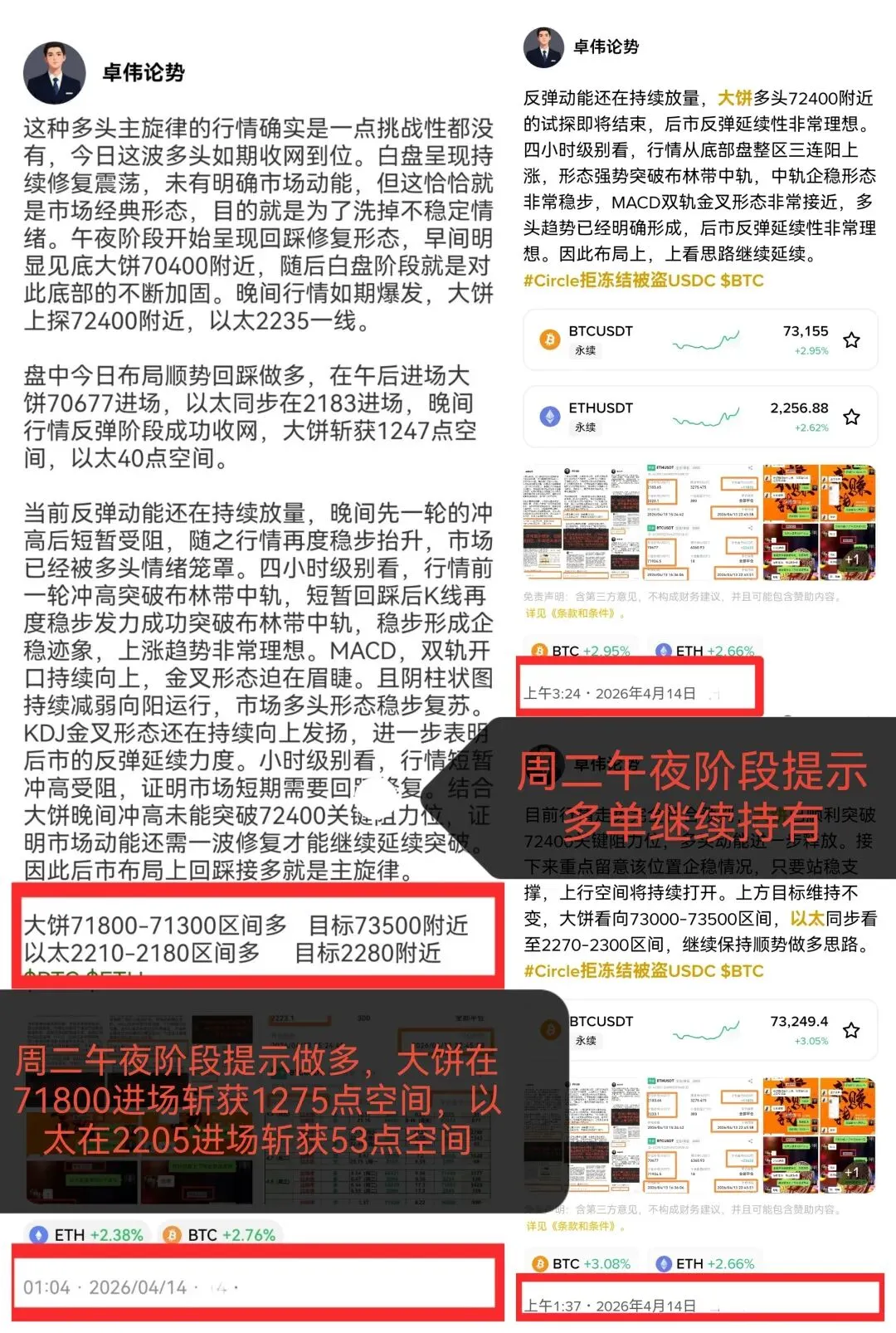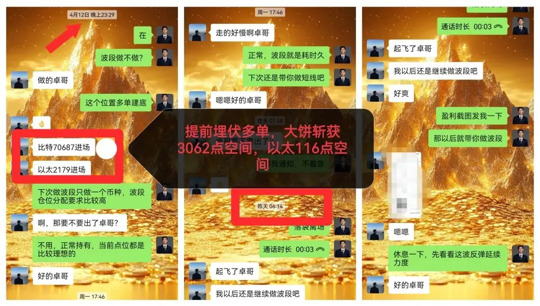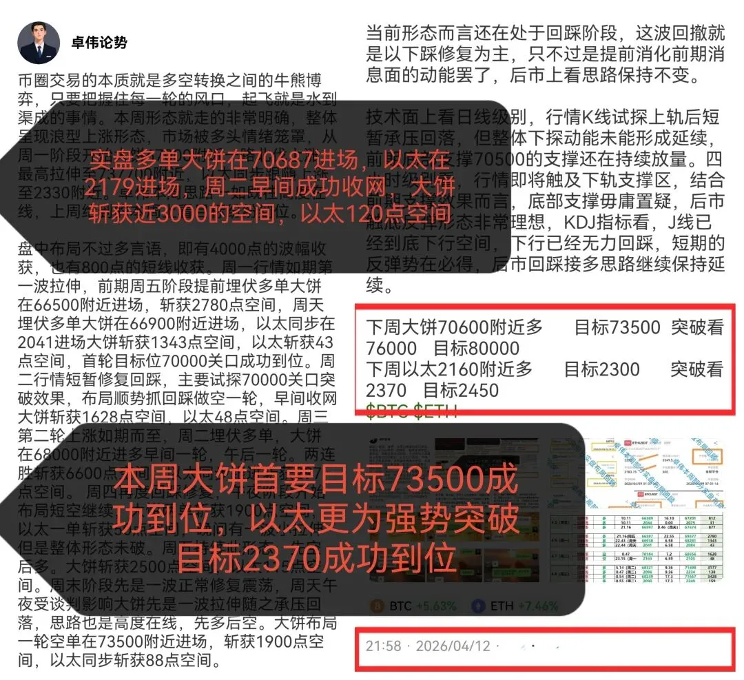 今日布局大丰收,多单拿到手软。上周末布局多单大饼在70600附近进多,以太同步在2179进场,今日早间双双落袋。大饼斩获3062点空间,以太斩获116点空间。