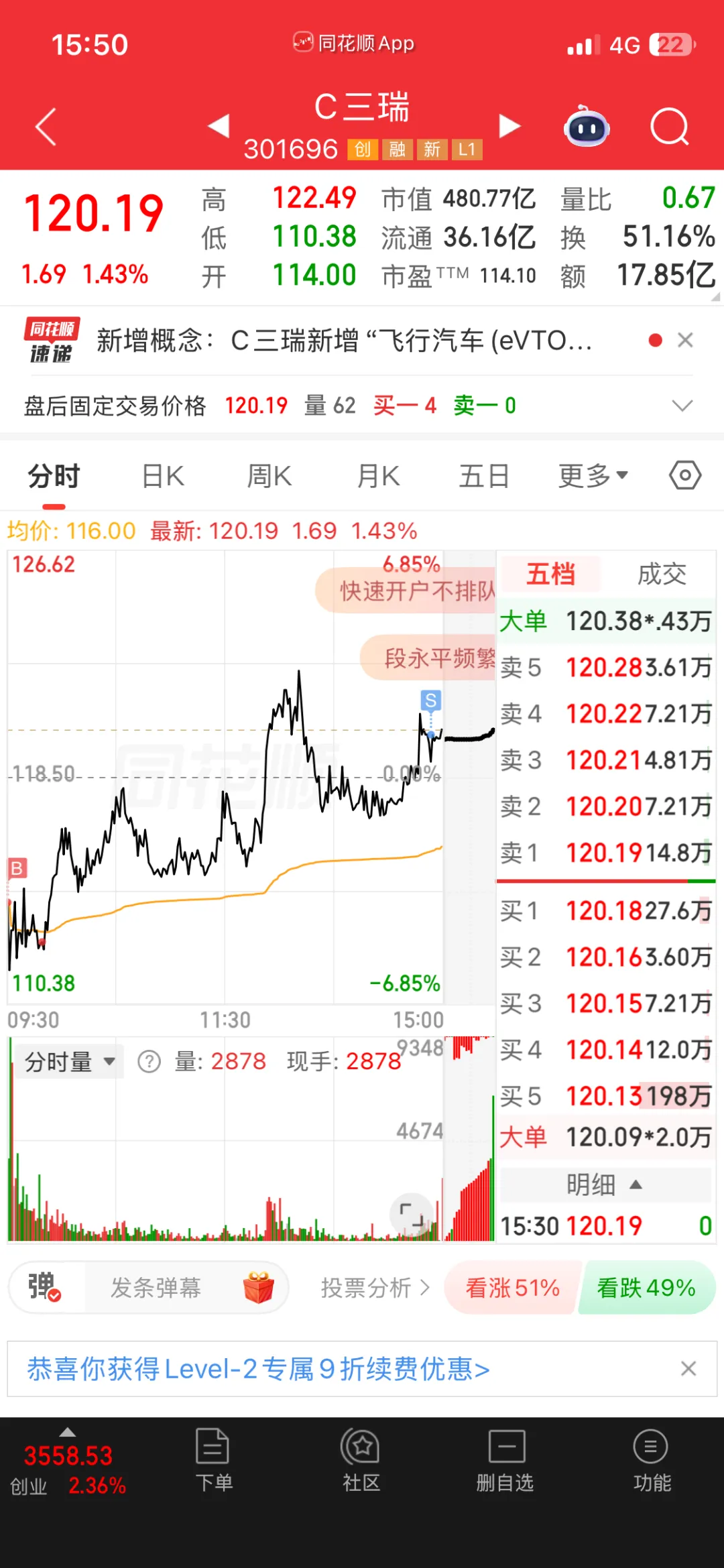 C三瑞:今日全天消化昨天筹码,部分资金离场,今天能低开高走收小涨已是很强,明日小高开符合预期,如果低开能迅速拉红动能仍在,若低开太多,结合今日缩量调整,则是离场信号,及时止盈。