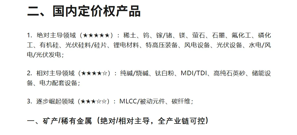 稀土永磁钕铁硼 | 72 | 85% | 38% | 中国资源垄断 | 中强 | 开采+冶炼管控、出口限制预期、风电/机器人支撑易涨难跌 | 中科三环、金力永磁 |