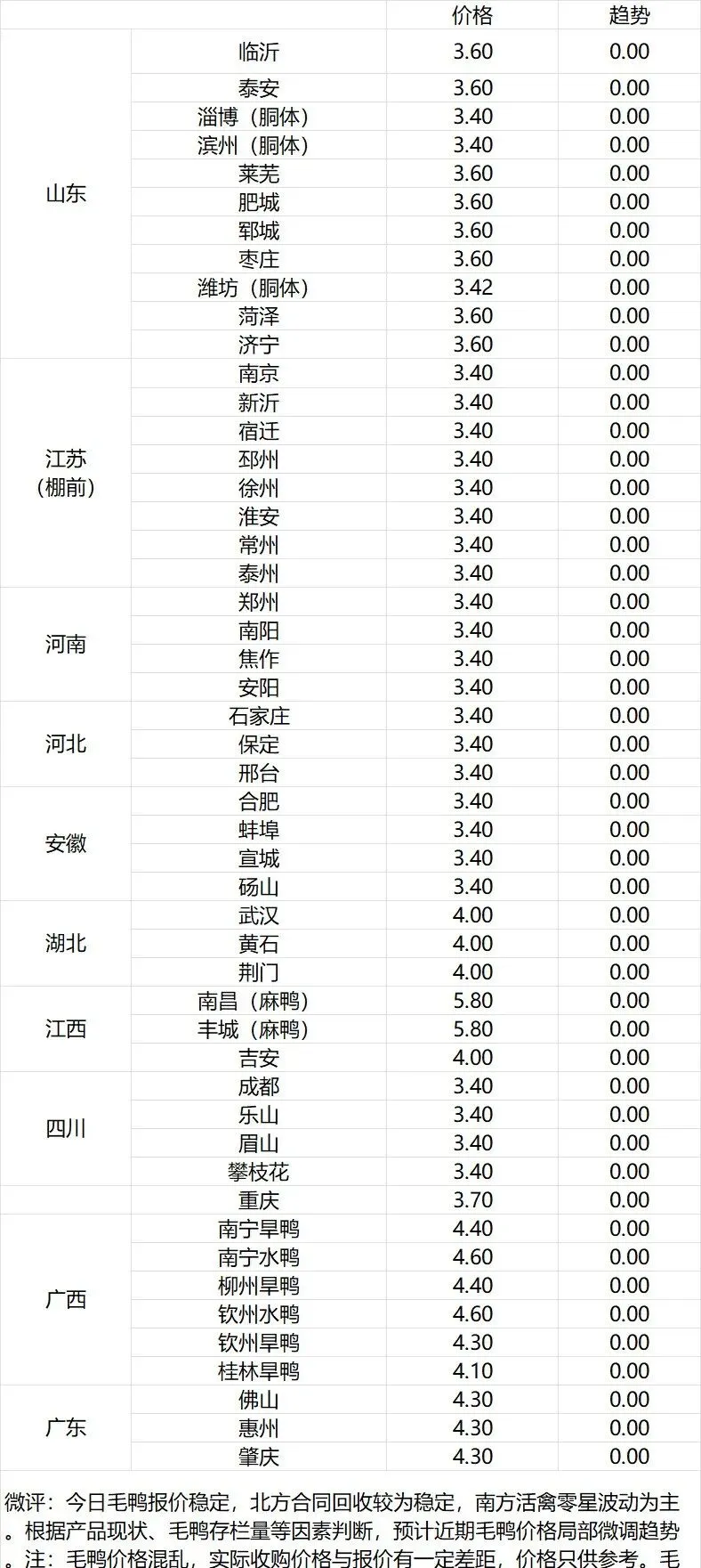 微评:鸭苗报价下跌。(注:南方只报当天价格)博弈加剧,情绪低迷,震荡走低。根据产品、养殖成本及鸭苗现状分析,预计近期鸭苗价格呈稳定为主趋势。种蛋报价稳定。温馨提示:该价格为主流厂家报价,实际销售价格以成交价格为准,价格仅供参考。