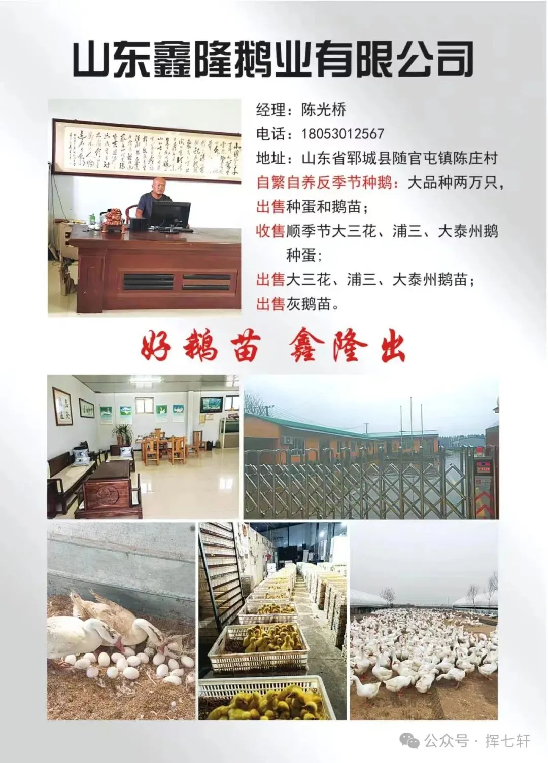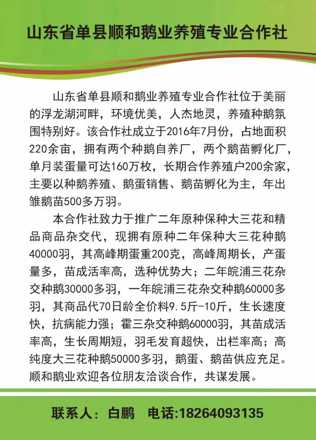 白鹏 | 山东省单县 | 18264093135 | 顺和鹅业专注于:二年保种大三花、二年浦三、精品霍三 |