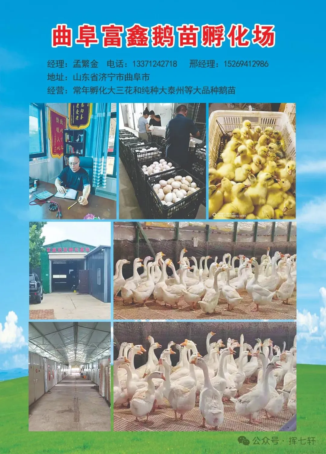 | 孟繁金 | 山东省曲阜市 | 13371242718 | 富鑫鹅苗孵化场-孵化大三花鹅苗 |