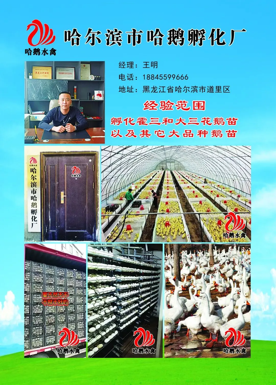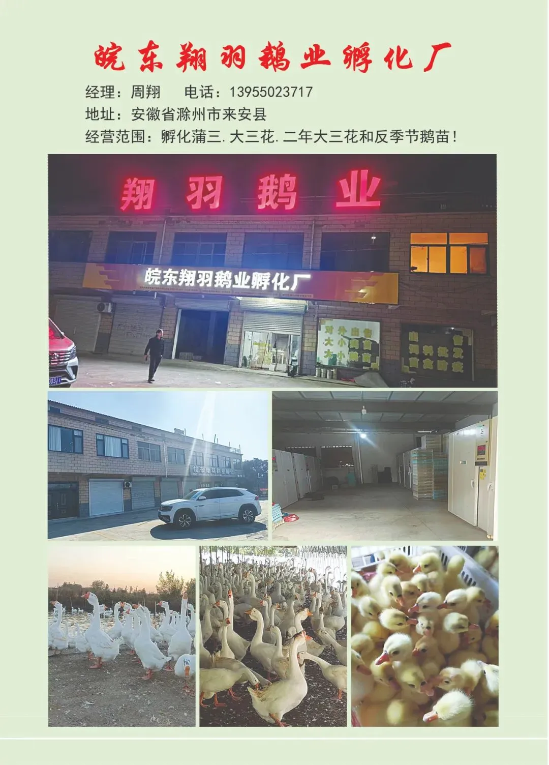 | 刘新民 | 佳木斯市汤原县诚信孵化场 | 15045400955 | 主营:孵化大品种鹅苗回收佳木斯周边商品鹅 |