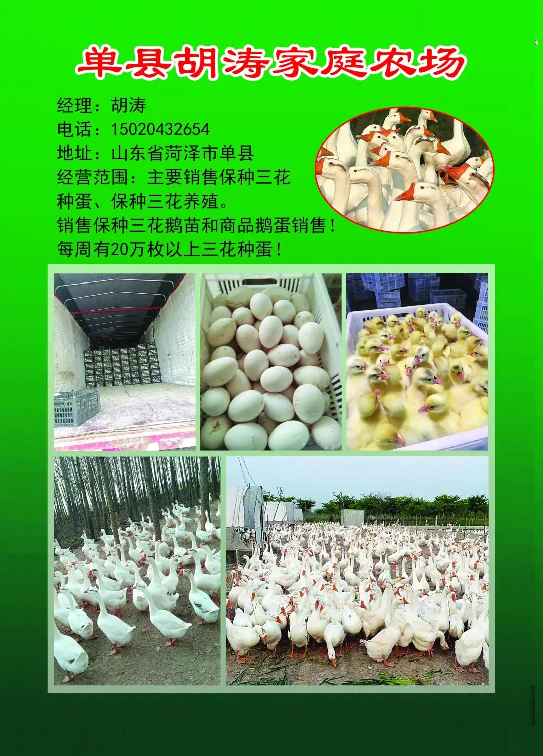 胡涛 | 菏泽市单县 | 15020432654 | 主营大三花种鹅和保种蛋 |