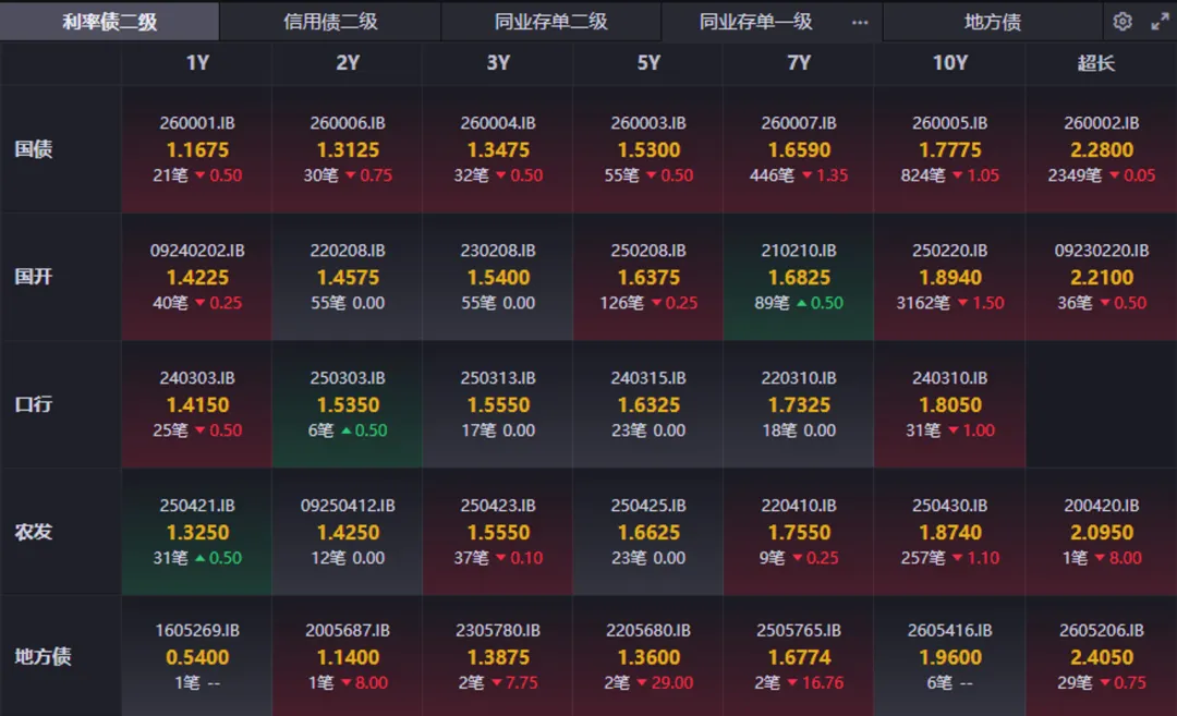 今日各期限收益率涨跌互现,整体收涨为主;日内收益率走势探底回升,前期的长端多头隐约有止盈迹象。