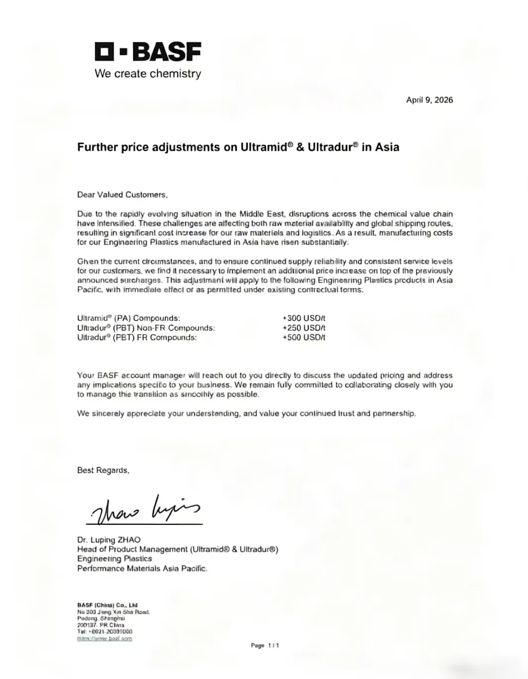 Ultramid®(PA尼龙)化合物:上调300美元/吨(折合人民币2046元/吨)