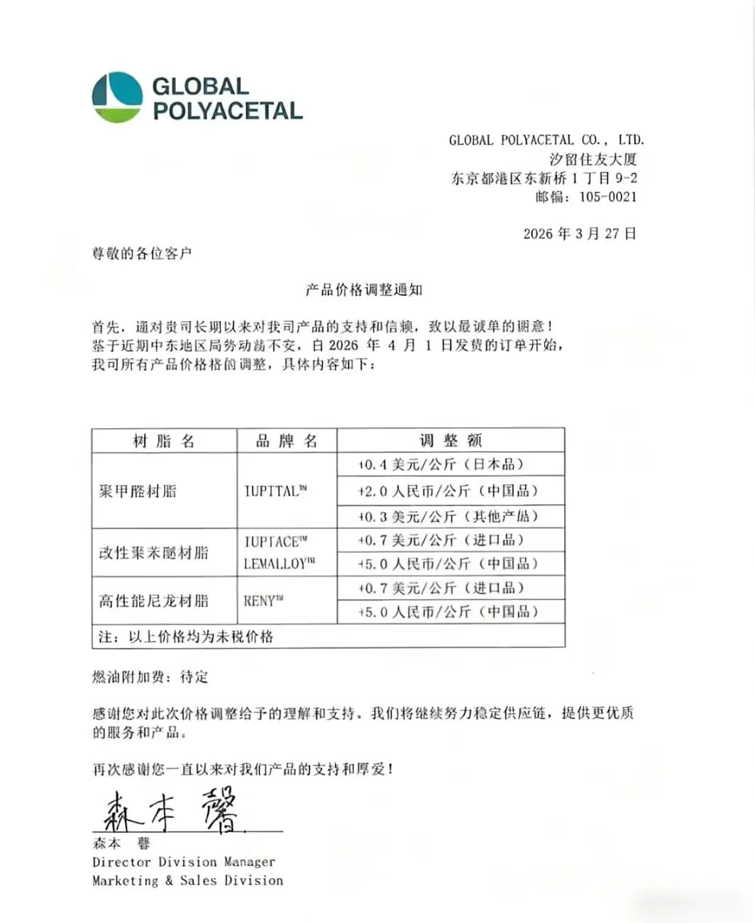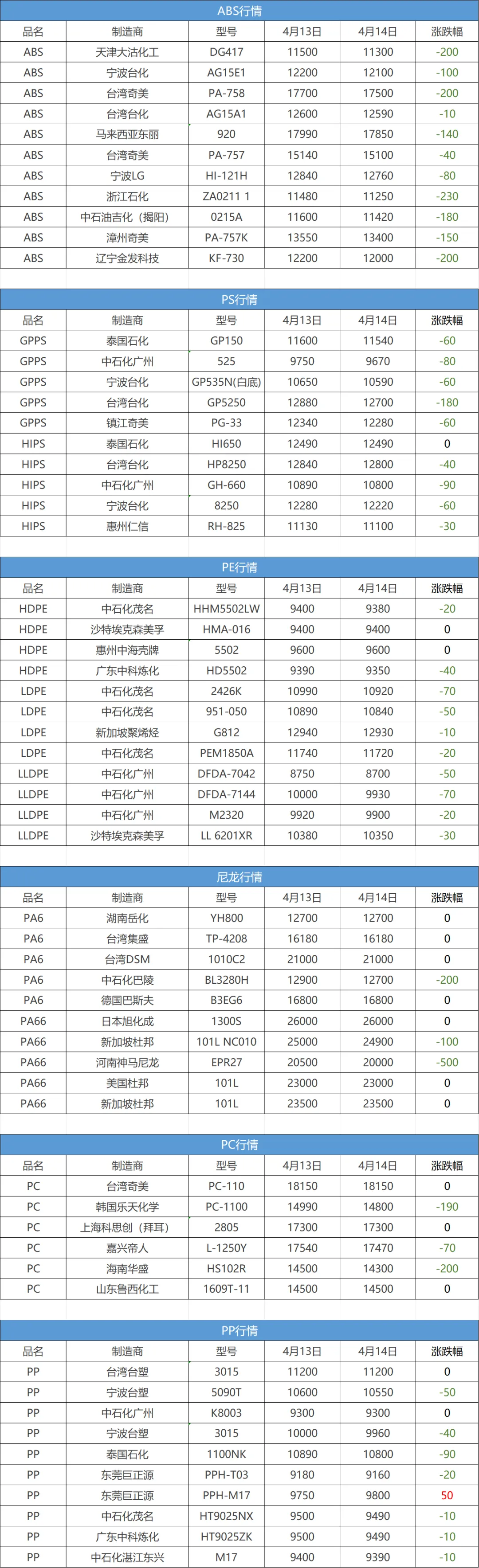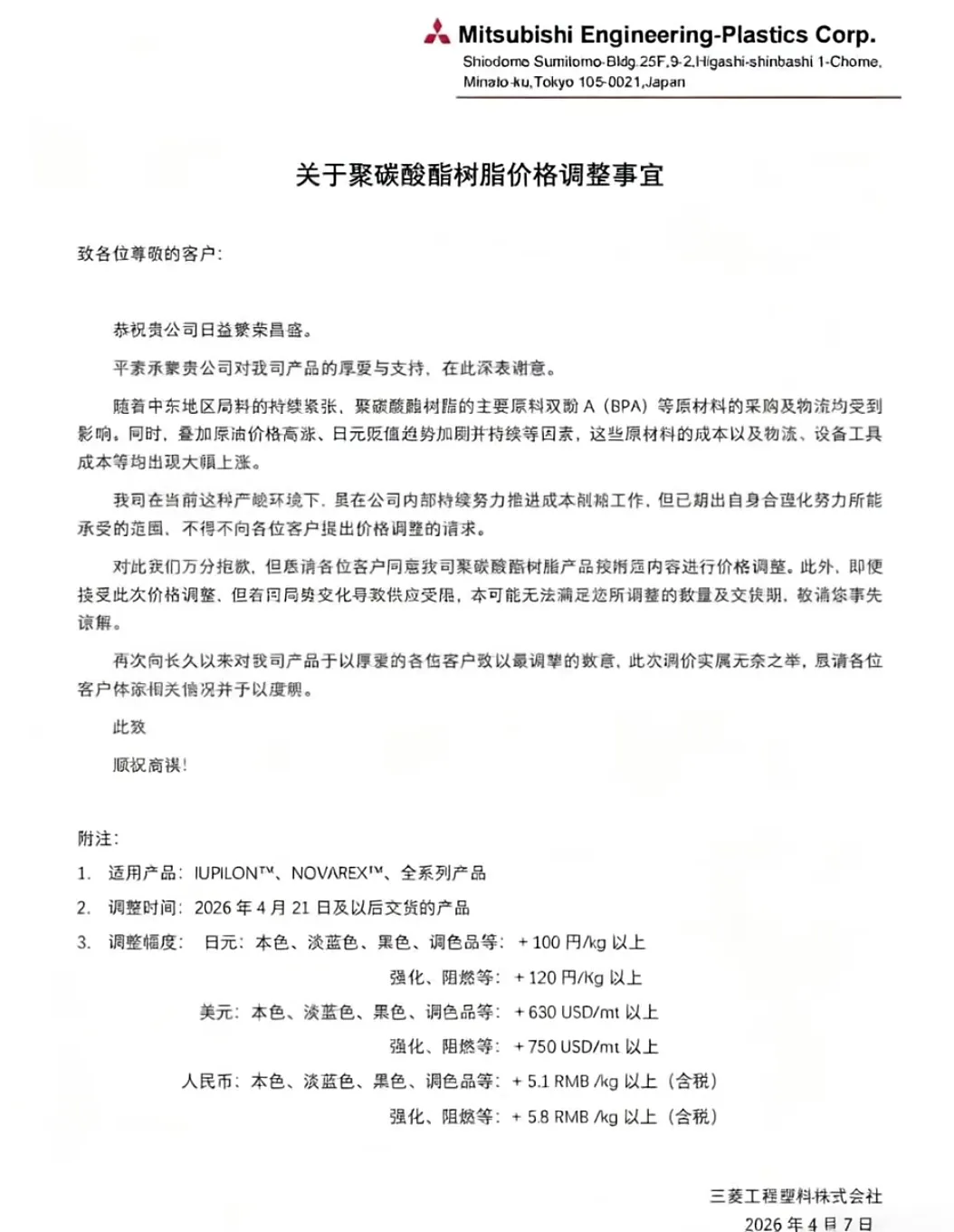 ▶三菱工程塑料:自4月21日起,其聚碳酸酯树脂全系列产品上调5100元/吨(含税)以上,强化阻燃规格更是上调5800元/吨(含税)以上。