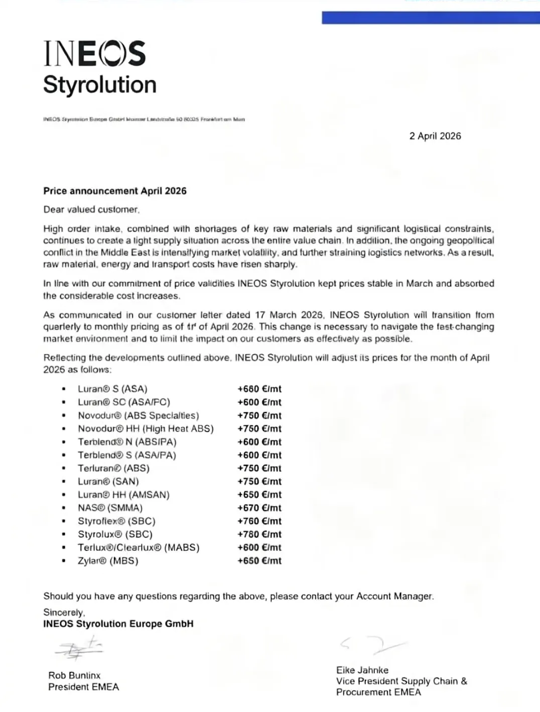 ABS(Terluran®)上调750欧元/吨(折合人民币6013元/吨)
