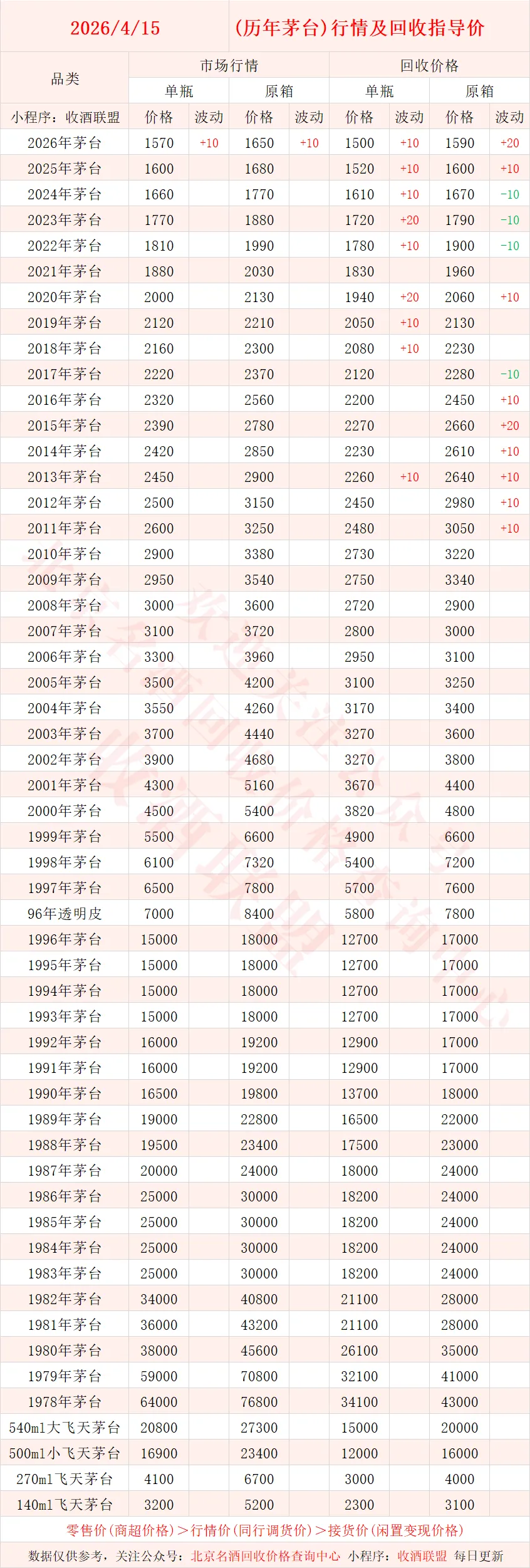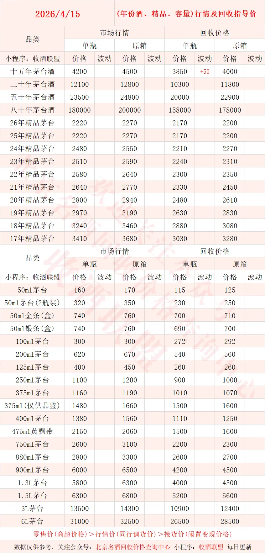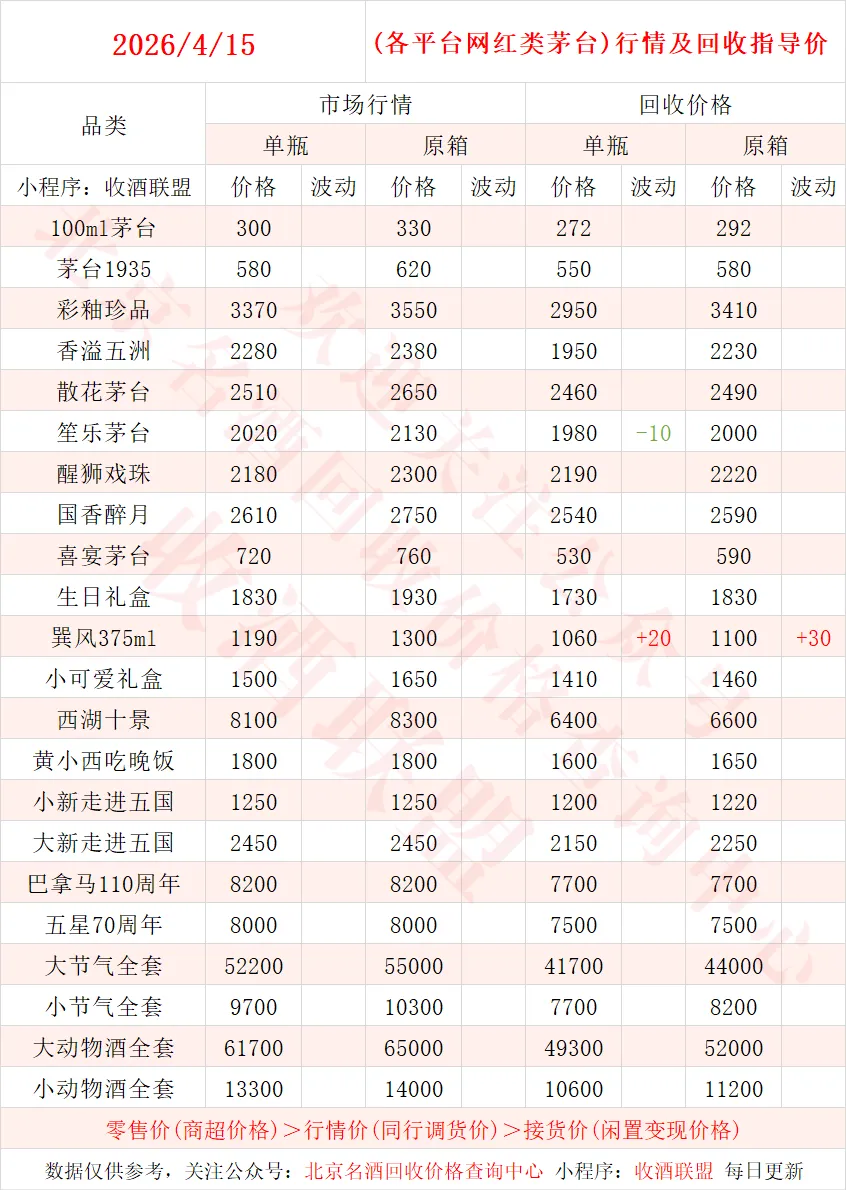 以下内容为,本公众号每日会及时更新的飞天茅台、生肖茅台、年份茅台,陈年茅台及不同毫升容量茅台的市场行情和回收报价;还包含五粮液、汾酒、剑南春、泸州老窖等国产名酒的行情及回收价,法国拉菲、木桐、玛歌等名庄红酒的回收报价,轩尼诗、马爹利、人头马等世界知名洋酒威士忌的回收参考价,每日整理不易,请点击关注支持。▪畅销类茅台行情及接货参考价▪