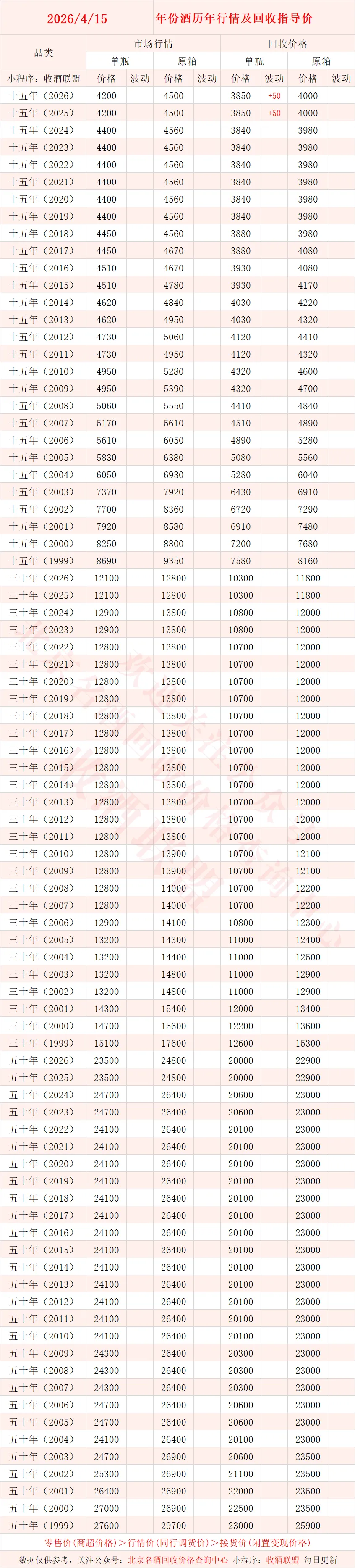 北京名酒回收价格查询中心,联系电话15652897909【同微】,专注于名酒回收行业的综合服务平台!是北京市价格认证中心、天津市价格认证中心的特聘专家,从业多年积累了各种名酒真伪鉴别经验,拥有多名品酒师、鉴定专家!累计服务数十家各省市价格认证评估,旗下小程序 “收酒联盟”,提供一键查酒价,不仅能一键查询各种名酒的价格,而且每日都会及时更新,保证你看到的都是新的准确行情。直接面向大众提供老酒,红酒,洋酒等真伪鉴定回收变现服务,回收价格专业靠谱!经过十余年磨砺,在全国100余座城市、四千多家业务会员酌情提供上门回收,是名酒回收行业中的翘楚!