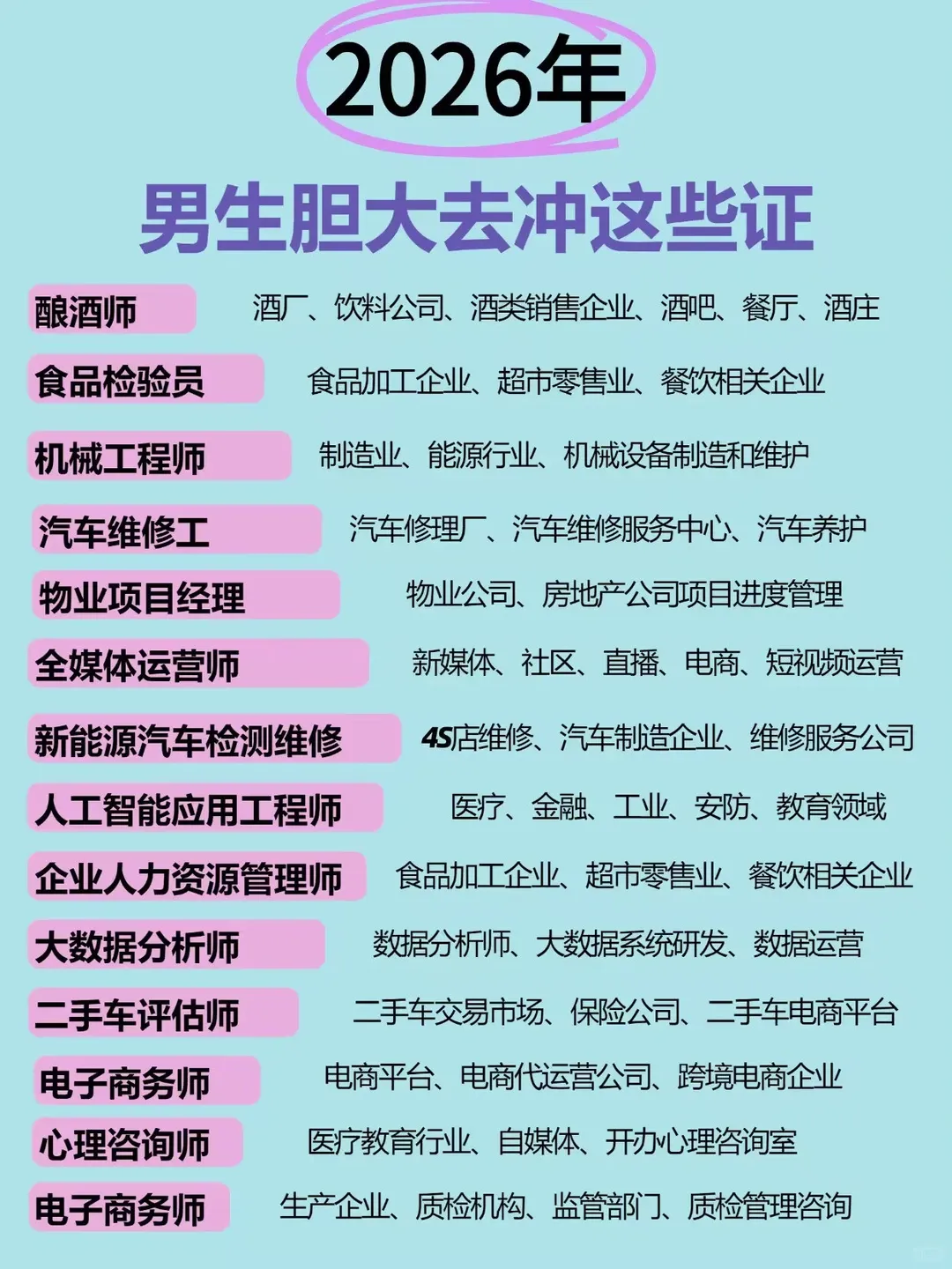 还有酿酒师、食品检验员、物业项目经理、二手车评估师、电商相关资质、心理相关学习、人力资源管理师等选择👏