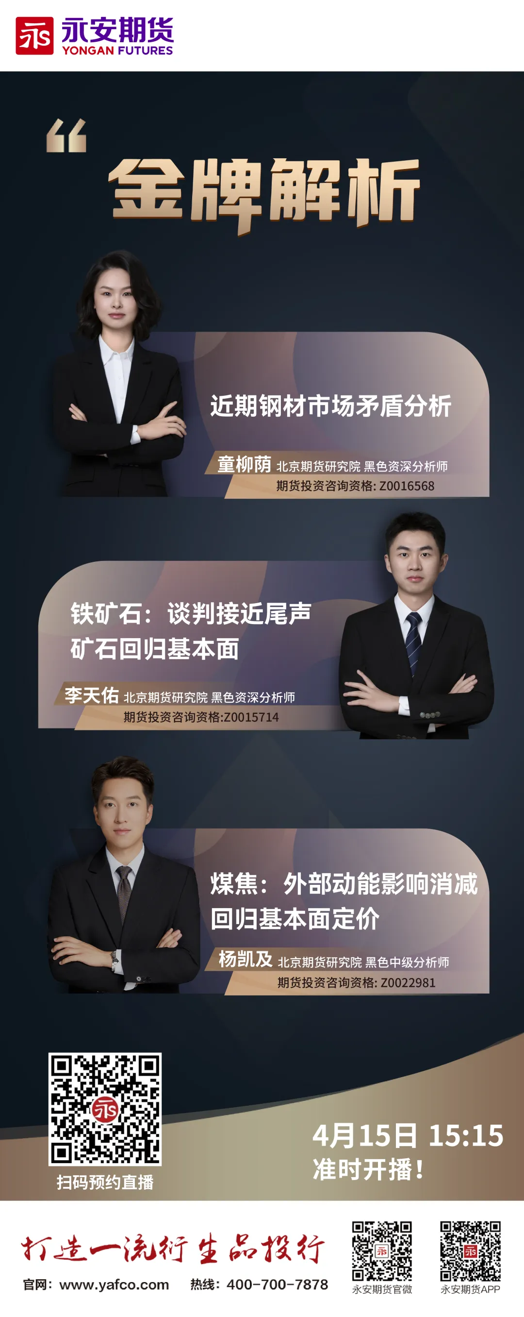 本栏目由永安期货研究中心、北京期货研究院金牌分析师团队倾力打造,围绕期货投研、行情热点,为您全方位解析市场热点和投资机会,每周一、三、五下午为大家带来“金牌解析”直播,一键预约,敬请关注!