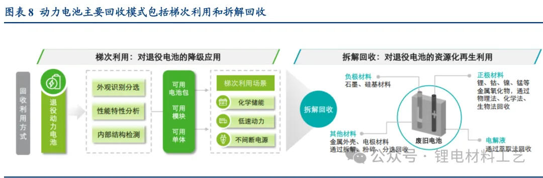 当前动力电池的寿命约8-10年,但对新能源汽车动力电池来说,当其电池容量衰减至额定容量的80%时,就不再满足使用要求,因此实际有效寿命约 5-7 年。退役后的动力电池可直接回收,也可梯次利用在低性能要求的场景中。梯次利用适用于容量衰减至额定容量 70-80%以下的动力电池,这类电池虽然不满足电动汽车的使用标准,但剩余电池容量仍能够满足其他设备的能源需求。对此类电池可实施拆解、筛分、重组,再系统集成为小型电池包,应用在一些对能量密度要求不高的领域,例如低速电动车(电动自行车、快递车等)、太阳能路灯、通信基站等。对于电池容量衰减超过 40%的动力电池,则会进入拆解回收工序。由于磷酸铁锂电池平均循环寿命相对更长(4000 次),电池容量衰减方式为缓慢均匀衰减,因此更适用于梯次利用;而三元电池平均循环寿命相对较短(2000 次),稳定性较差,且含有镍钴锰等稀有金属,因此回收方式以拆解回收利用为主。