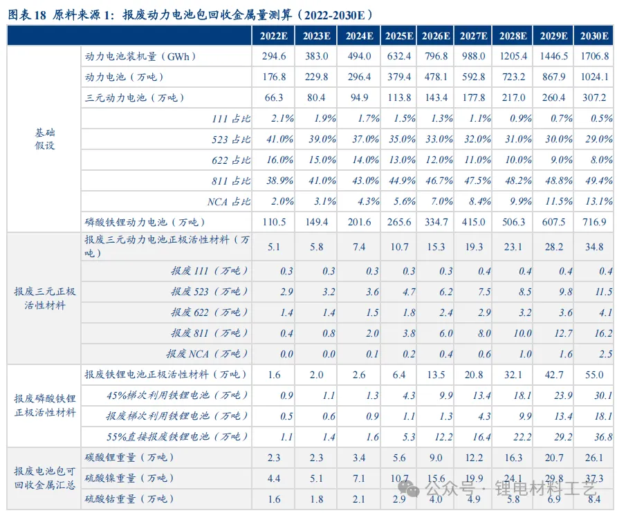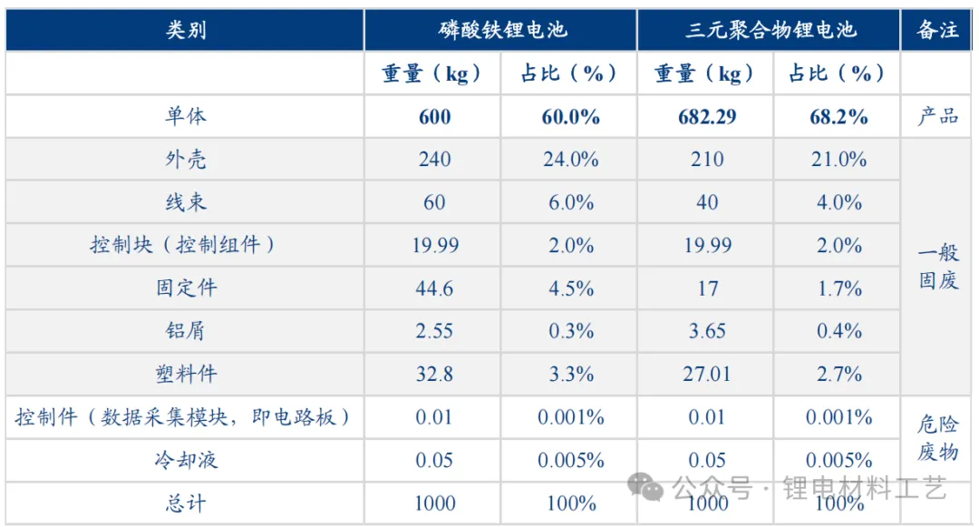 对于废旧电池包/电池包生产边角料的回收:根据邦普循环,磷酸铁锂电池包质量构成来看,单体占比 60%、外壳占比 24%。其中磷酸铁锂电池单体中,正极活性材料磷酸铁锂占比 32.1%,因此对于磷酸铁锂电池包整体,磷酸铁锂占比约 20%。三元聚合物锂电池包质量构成来看,单体占比 68.2%、外壳占比 21%。其中正极材料在三元锂电池质量中占比 39%。参考正极材料中 88-89 wt.% 为正极活性材料,因此对于三元锂电池包整体,三元材料占比约 24%。