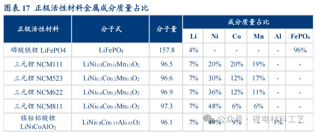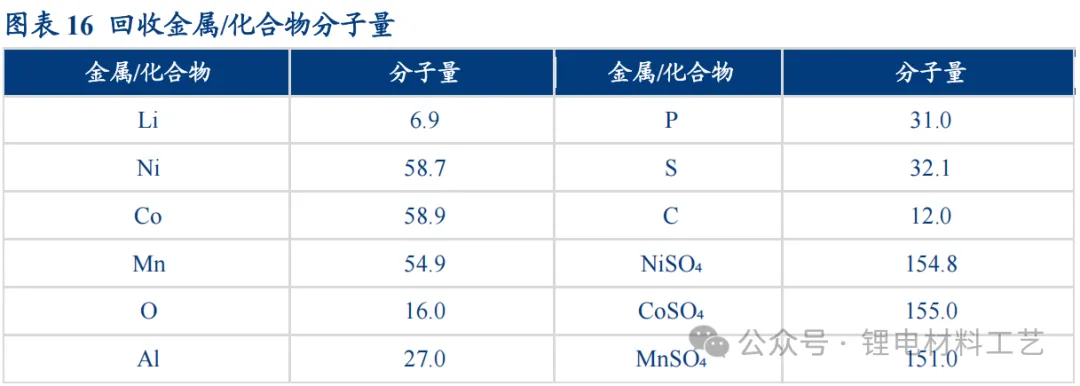 3) 正极活性材料中,各金属质量占比参考图表 14、15;由于正极活性材料回收较少以金属单质形式,因此我们以主流金属化合物测算市场空间,镍、钴、锰、锂对应的金属化合物分别为硫酸镍、硫酸钴、硫酸锰、碳酸锂。