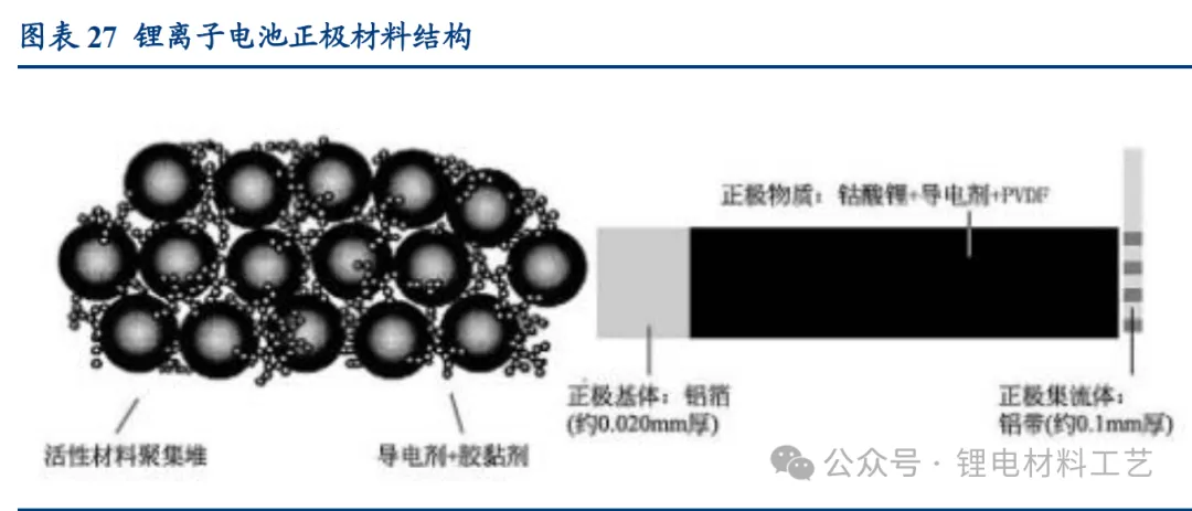 正极:88-89wt.%正极活性材料、7-8wt.%乙炔黑导电剂和3-4wt.%有机粘合剂,均匀混合后涂布于10-20微米的铝箔集流体上,即组成锂离子电池正极。常见正极活性材料包括磷酸铁锂(LiFePO4,LFP)、钴酸锂(LiCoO2 ,LCO )、 镍钴锰三元材料(LiNixMnyCo1-x-yO2,NCM)、镍钴铝三元材料(LiNixCoyAl1-x-yO2,NCA)等。