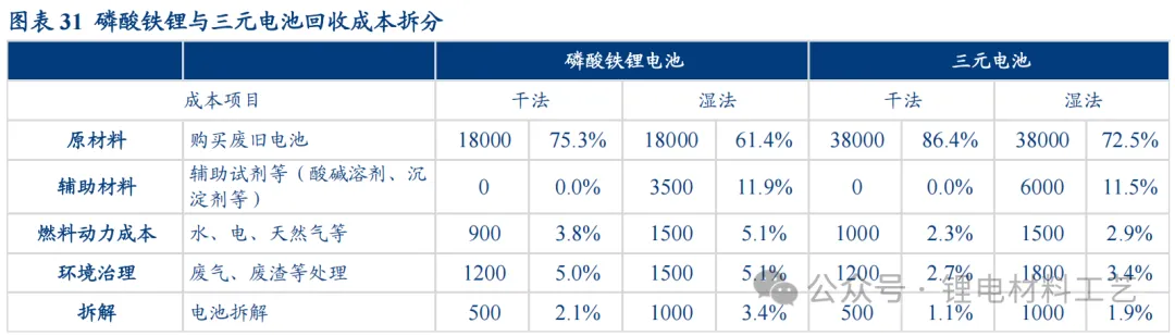 成本端来看,电池回收成本结构主要分为两大块:废电池本身的费用和加工费。废电池本身的费用占比通常超过总体的 50%,其他加工费包括辅助材料成本、燃料动力成本、环境治理成本、设备成本、人工成本、其他支出(场地费、公摊费、税费)等。参考黎华玲等《锂离子动力电池的电极材料回收模式及经济性分析》及 SMM 近期废电池回收价格,对于磷酸铁锂电池,假设电池包回收价格为 18000 元/吨,干法与湿法回收单吨成本(购买电池包以外)分别为 5900 元/吨与 11300 元/吨,总回收成本分别为 23900 元/吨与 29300 元/吨;对于三元电池,假设电池包回收价格为 38000 元/吨,干法与湿法回收单吨成本(购买电池包以外)分别为 6000 元/吨与 14400 元/吨,总回收成本分别为44000 元/吨与 52400 元/吨。