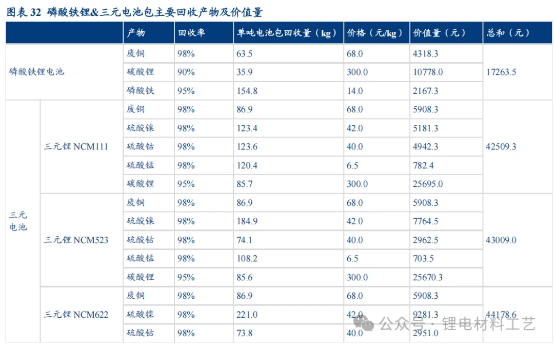 对于三元电池,当前主要回收产物是硫酸镍、硫酸钴、硫酸锰、碳酸锂。参考本文第二章的测算,三元动力电池包中,单体质量占比约 68.2%,单体中正极材料质量占比约 39%(活性材料在正极材料中质量占比 88-89%),铜箔质量占比约 13%;按照回收率铜箔98%、硫酸镍 98%、硫酸钴 98%、硫酸锰 98%、碳酸锂 85%假设,则单吨不同三元电池包 可 提 取 废 铜 86.9kg 、 硫 酸 镍 123.4~293.6kg 、 硫 酸 钴 36.8~123.6kg 、硫酸锰35.8~120.4kg、碳酸锂 84.9~85.7kg,对应主要回收产物价值量 4.2-4.5 万元/吨三元电池包。