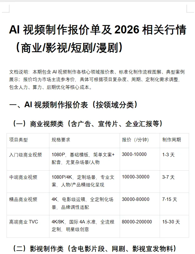 文档说明:本期包含AI视频制作各核心领域报价表、标准化制作流程图解、典型案例展示;报价均为市场主流参考价,具体可根据项目复杂度、周期、定制化需求调整,包含人力、算力、后期优化等核心成本。