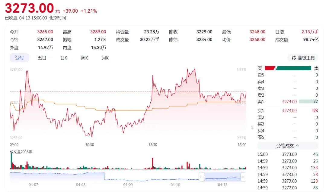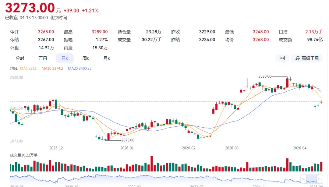 最近(2026 年 4 月)从 3530 的高点回落,最低跌到3248,目前在 3273 附近震荡,属于上涨后的回调阶段。
