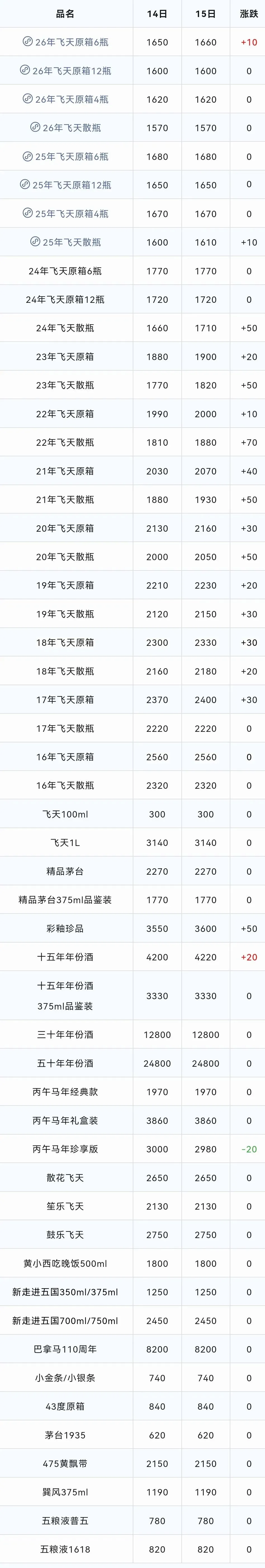 常规茅台中:2026年飞天原箱6瓶装、十五年年份酒,25年彩釉珍品,25年飞天散瓶,24年飞天散瓶,23年、22年、21年、20年、19年、18年飞天原箱散瓶,17年飞天原箱上涨;