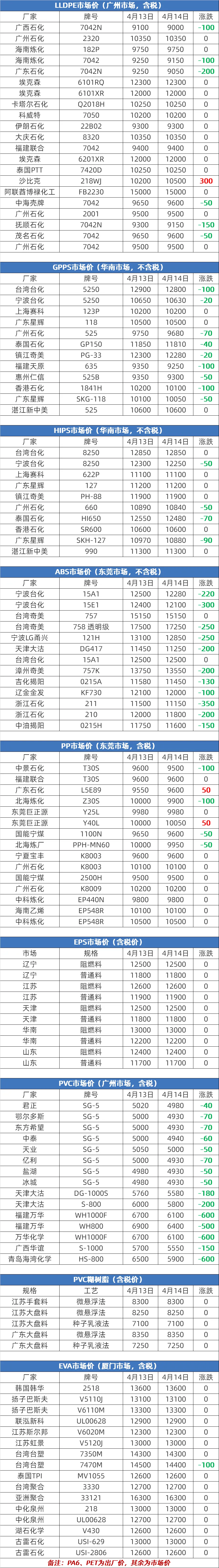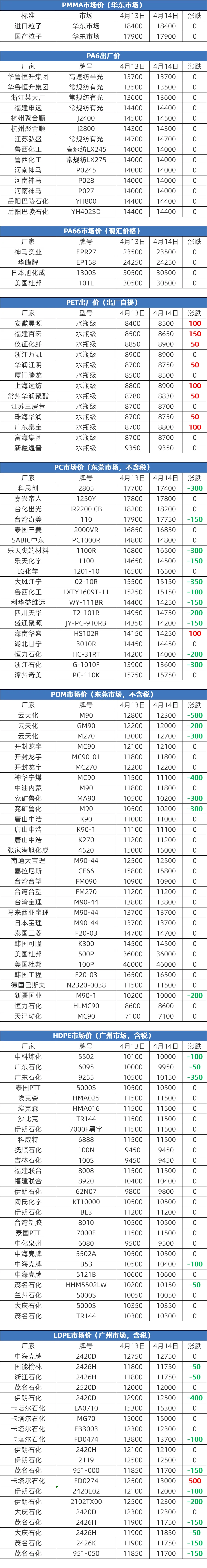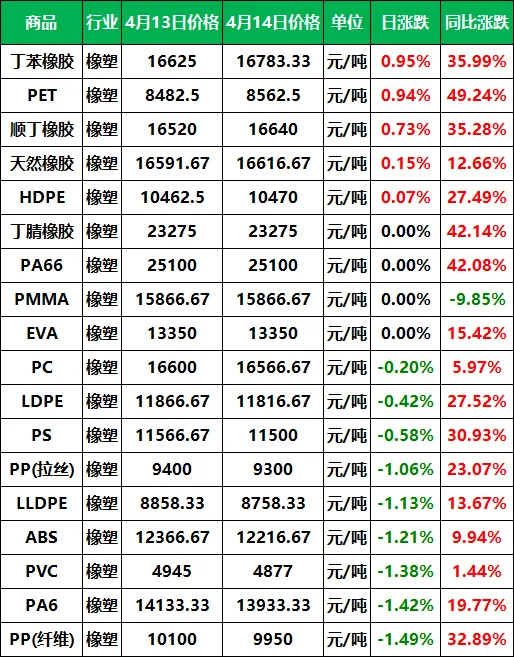 2026年4月14日大宗商品价格涨跌榜中橡塑板块环比上升的商品共5种,涨幅前3的商品分别为丁苯橡胶(0.95%)、PET(0.94%)、顺丁橡胶(0.73%)。
