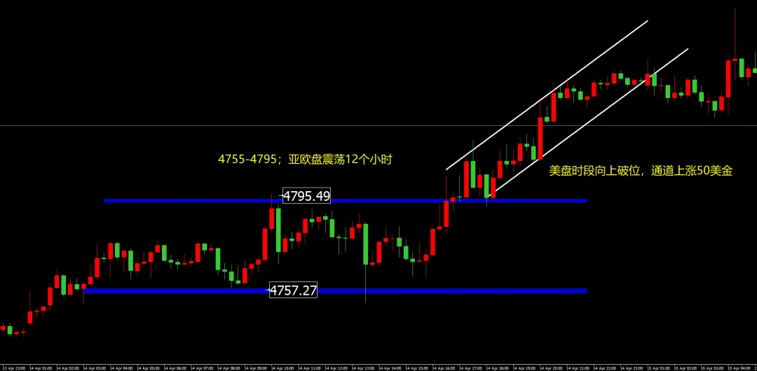 昨天亚欧盘,黄金就在那40美金(约4755-4795)的箱子里晃荡了整整半天,价格上不去下不来,像在憋大招,美盘一开,价格像火箭一样冲破了小箱子的顶部,然后就沿着上升通道一口气涨了近50美金。