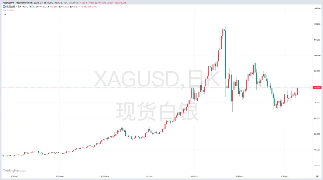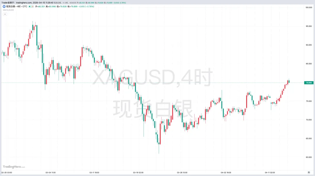 2026年4月15日,现货白银上演疯狂行情!昨日以74.932开盘后,全天单边暴涨5.24%,最终以79.537光头光脚大阳线收盘。今日早盘延续强势冲高至80.998,但随后快速回落至79.899,多空在80美元整数关口展开激烈博弈。