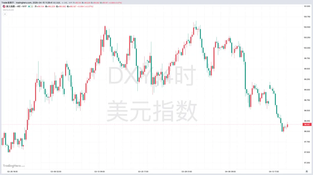 美元指数昨日下跌0.33%,4小时图呈现双顶形态破位,下方支撑97.966若失守,将进一步打开下行空间。美联储4月维持利率不变概率高达98.4%,且市场预期2027年前难降息,实际利率下行预期支撑白银估值。
