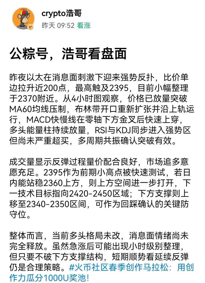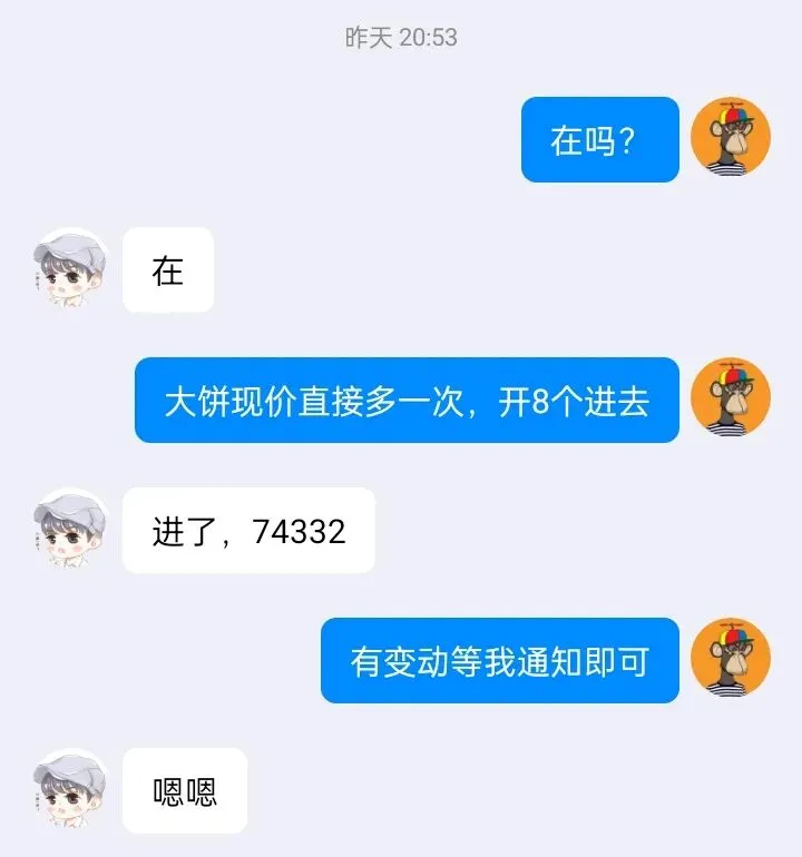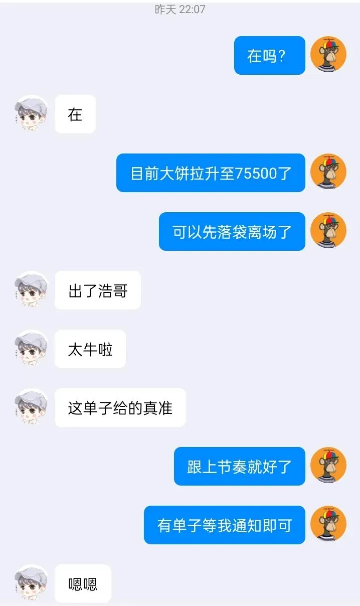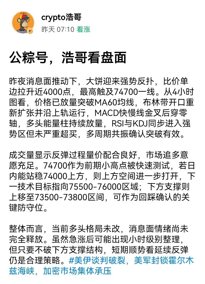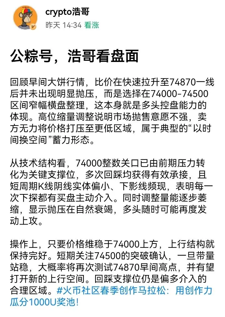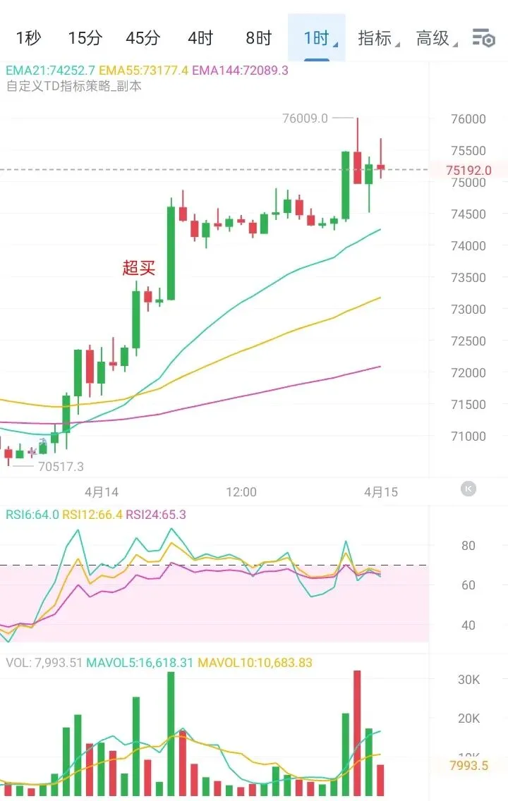 昨晚美股三大指数低开,但大饼并未跟随下跌,反而走出独立强势行情。价格自74000关口企稳后放量拉升,最高触及76000一线,随后小幅回踩,目前运行于75000附近。我们晚间布局的74300多单成功止盈1200余点空间,多头动能持续释放。