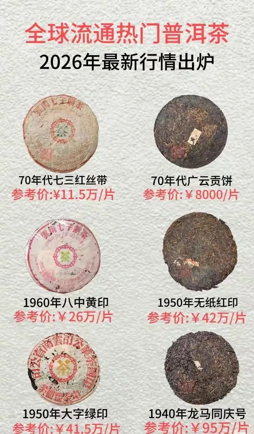 2026年全球流通热门普洱茶行情已更新,老茶与高端班章系列依旧占据市场核心,不同年代、版别的茶品价格差异显著,以下是详细行情参考。一、早期古董级普洱老茶行情