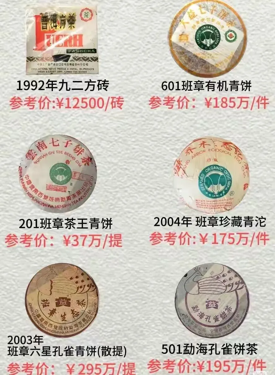 从2026年行情来看,普洱茶市场呈现明显的分层特征:古董级老茶因历史价值与存世量稀缺,价格持续坚挺,1940年龙马同庆号、1950年无纸红印等顶级老茶仍是收藏界的硬通货;中期茶(80-90年代)因陈化效果与性价比,成为市场流通的主力,8582、八中黄印等品种备受追捧;高端班章系列则凭借原料稀缺性与品牌溢价,价格屡创新高,2003年班章六星孔雀青饼以295万/提的价格成为现代普洱茶的价格天花板。