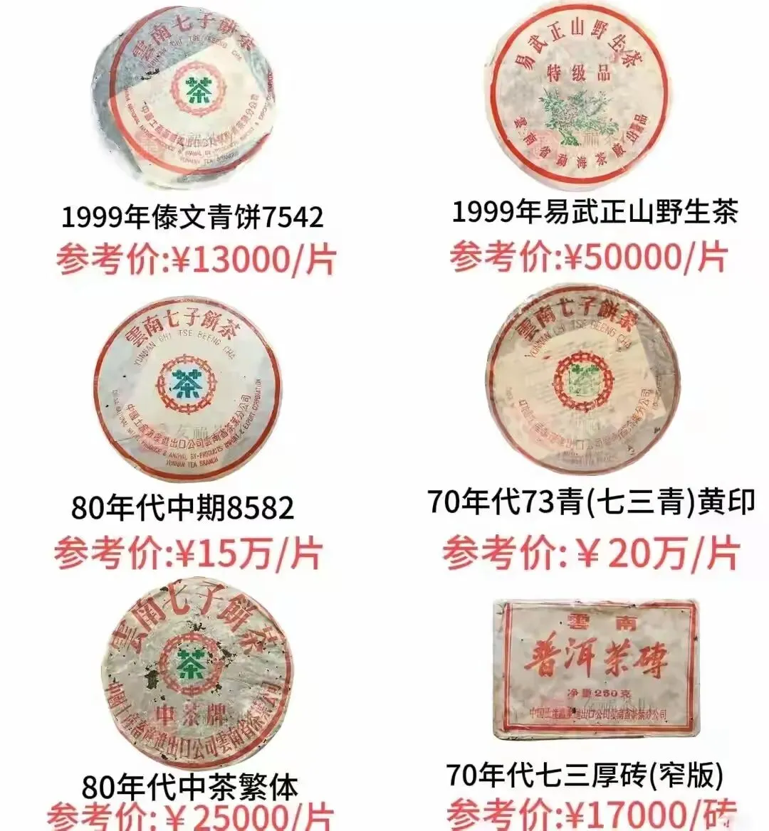 70年代七三红丝带:参考价11.5万/片,红丝带标记是其身份标识,作为70年代七子饼茶的代表,存世量相对较多,价格在老茶中更具性价比,适合进阶收藏。