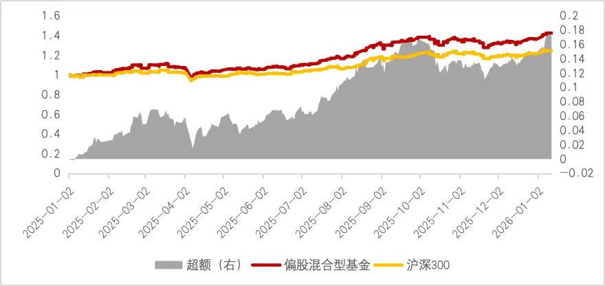 观察2025年以来的表现,偏股混合型基金相对于沪深300指数的超额收益随着市场上行逐步扩大,一定程度上说明在上涨行情中,基金经理的选股能力可能更容易转化为组合的相对优势。
