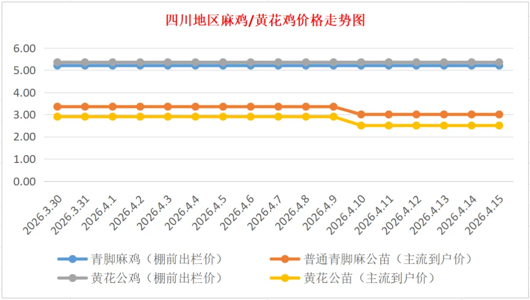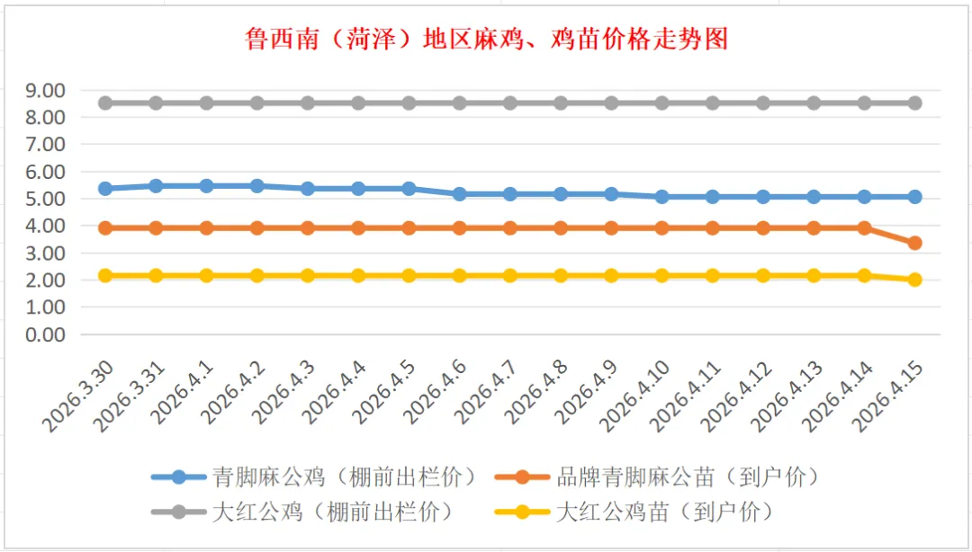 品牌青脚麻公苗(多品种快大型):价格稳定,到户价4.50元/羽,稳。