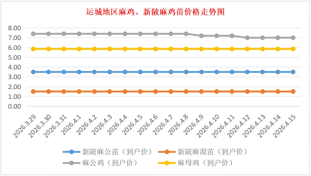 普通新陂麻:价格稳定,到户价公苗4.00元/羽,稳。