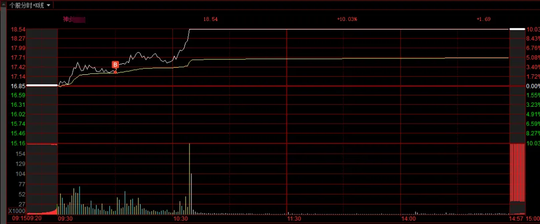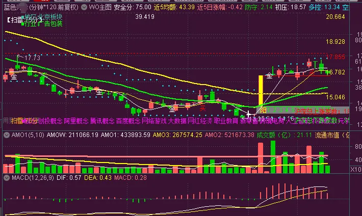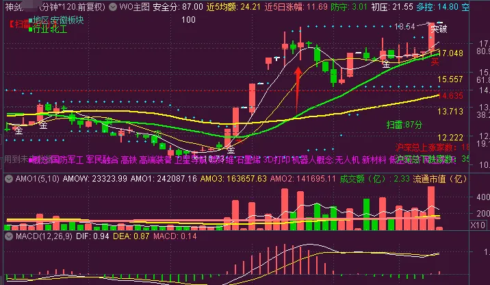 比如像商业航天的神剑,它在120分早于大盘回调,所以在大盘回调时,它反而率先突破:相叉回顶,回坐不破21线,依托21线而做蓄势攻击。