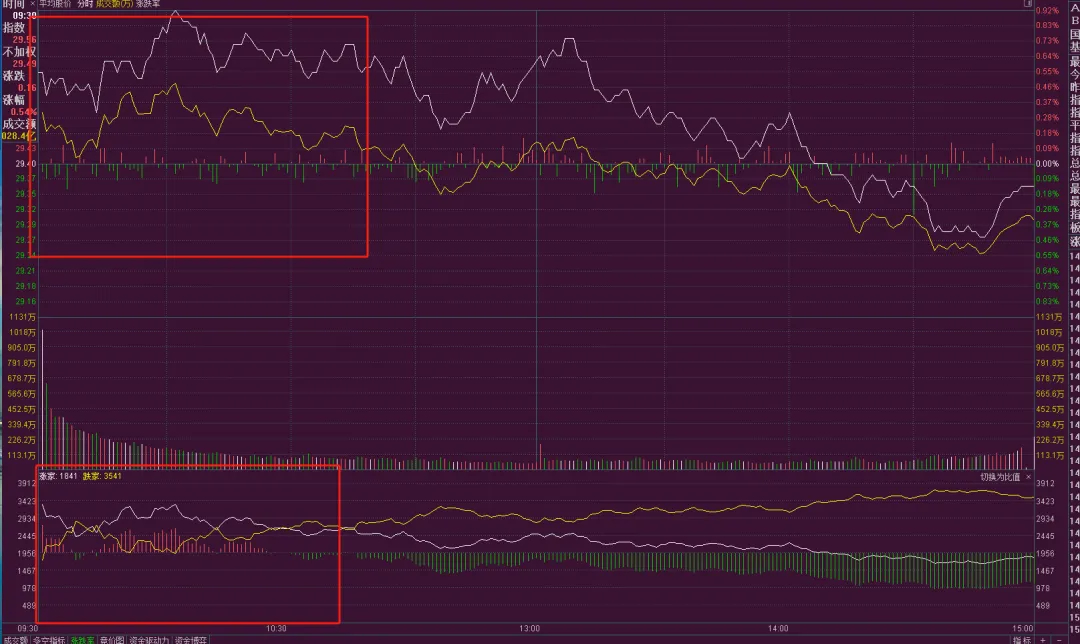 今天市场是再度跳空高开,早盘一度有3000+的个股上涨,而尾着大盘的冲高回落,多数个股也跟随下跌,并且出现越来越多的家数: