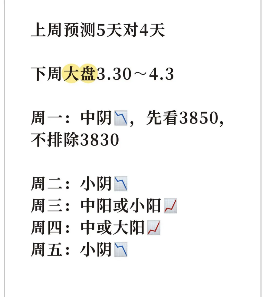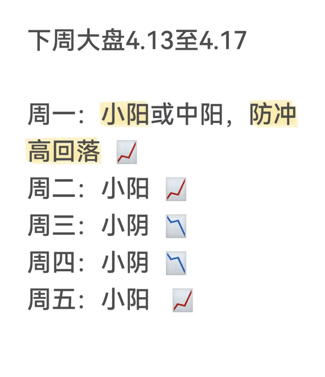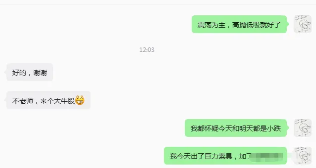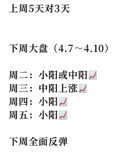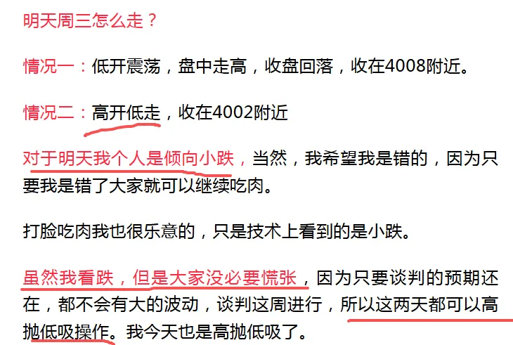 今天的盘面意料之中的高开低走,因为连涨几天了,在没有大的消息刺激下,指数会消化这几天反弹的获利盘。所以出现高开低走不奇怪,虽然高开低走,但是目前的盘面还是没问题的,市场还比较健康,走势和盘面都很正常。不要害怕一两天的回踩,今天创业板跌比较多,主要是又创新高了,还是10年的新高,资金都是恐高的,所以,创业板今天带头回调。情况2比较符合,高开低走,但是收盘位置不对,没那么低,主要是高开10几个点,如果大盘平开或者小幅高开就更完美了。只要确定盘面没什么问题,就不需要去担心,该出手就出手,但是不要去追妖,追高。看一些低位的,调整时间长的,有辨识度的板块:商业航天,算力,消费电子,军工,机器人这些都可以,位置低,辨识度高,调整时间长。昨天发了几个朋友一张截图,今天一堆人问我是谁预判的,是我自己的预判,哈哈。既然那么多人想看,就放出来吧。现在是周三了,其实这个预判我做了好几周了。如果大家感兴趣,我以后也可以发在这里。过去几周准确率挺高的,特别是上周四天行情对三天,如果不是黄毛的发话,四天全对。上周很多人不看好,特别是上周三我看中阳很多人都以为我傻了,哈哈,结果当天涨了104个点。仓位可以暂时不动,做t就好了,千万不要格局,格局容易过山车。